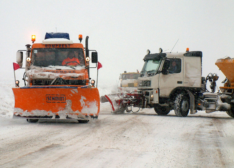 Ce avem noi mai sus? Păi un Mercedes-Benz (prietenii îi spun Unimog), iar alături un Volvo. Da, exact, un FH, Globetrotter, mai mult ca sigur, dar nu băgăm mâna în foc… ăăă, pardon, în zăpadă!