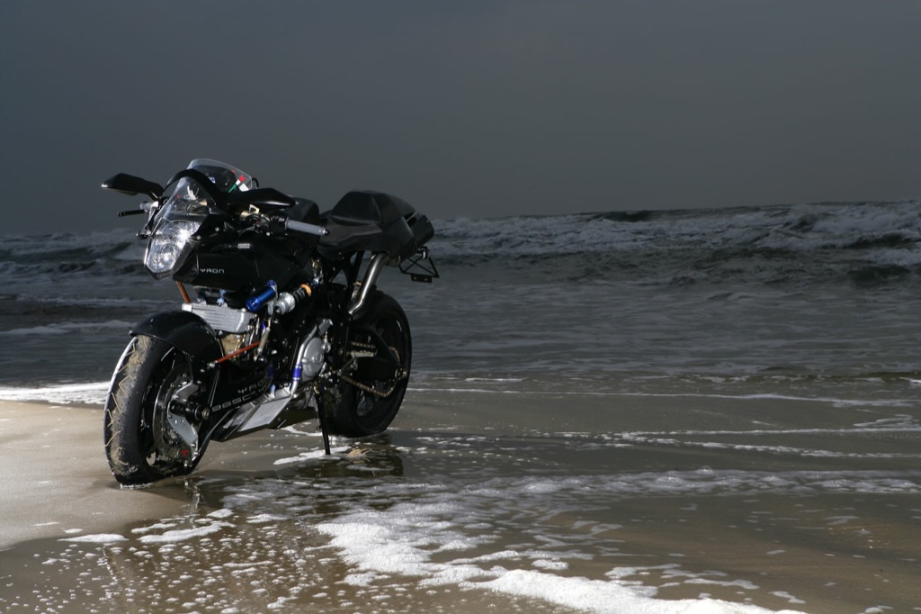 Mâtzo, scuzele de rigoare că am intat pe teritoriul tău, dar cei de pe site-ul http://www.ridelust.com se întreabă dacă nu cumva acest monstruleţ cu două roţi este unul dintre cele mai puternice motociclete de producţie în serie din lume. În fotografie, modelului îi este testată rezistenţa la salinitatea apei, după ccum se relatează pe acelaşi site. Motocicleta are un motor de provenienţă DUCATI, cu 211 CP şi o cilindree de 1198 cmc.Momentan, ne oprim aici cu informaţiile, pentru că Mâtza deja fierbe ca un motor supraturat… de motocicletă 🙂