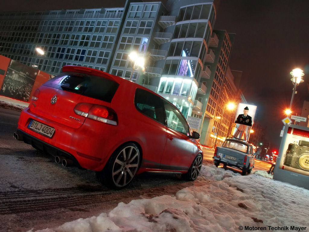 Dacă într-o seară în care te afli în Germania, mai exact în Berlin, jumătăţii tale i-ar veni ideea să faceţi nişte fotografii inedite pentru albumul vostru, iar la dispoziţia voastră s-ar afla un VW Golf 6 GTI, situaţia este ca şi rezolvată. Mai mult decât atât, GTI-ul vostru nu este unul oarecare, ci un exemplar care tocmai a fost modificat de tunerul MTM (Motoren Techink Mayer). Acesta a fost darnic şi ţi-a oferit 310 CP, capabili să producă 410 Nm şi o viteză maximă de 270 Km/h, după ce ai atins prima sută în 5,7 secunde. Pentru că fotografiile voastre vor fi admirate de prieteni, maşina a fost încălţată de cei de la MTM cu jante sport de 19″, marca BIMOTO, cu 9 spiţe şi suficient de generoase pentru a acoperi discurile de frână MTM de 380 mm. Suspensiile au fost modificate şi ele, iar în faţă, maşina este mai joasă cu 30 mm. Deci… poţi să treci la treabă, mai ales că peisajul de iarnă german contribuie la reuşita fotografiilor voastre.