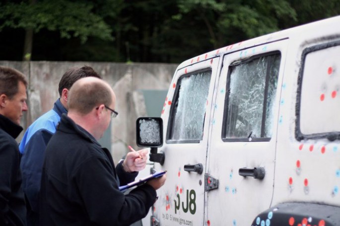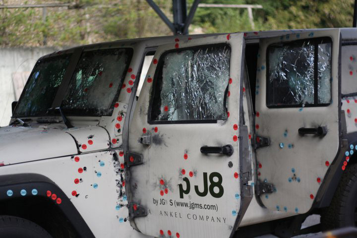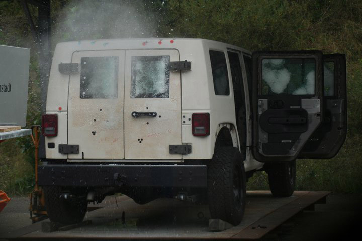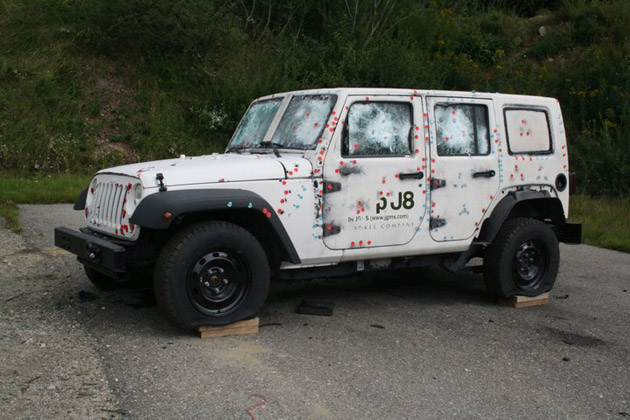 Jeep vrea să se reînroleze în armată, iar pentru acest lucru trebuie să treacă nişte teste balistice. Compania a anunţat că ,,soldatul” corespunde nivelului de siguranţă BRV 2009 VR7. Dacă asta nu-ţi spune prea multe, este suficient să ştii că acest model blindat te va apăra cu armura antiglonţ până la locul de muncă. Desigur, dacă se întâmplă să fii atacat cu o armă de calibru mic… momentan. Priveşte câteva fotografii de la testul balistc: