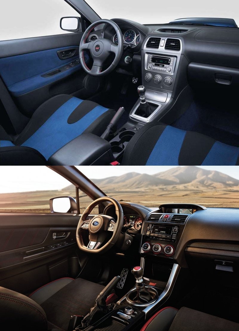 Impreza WRX STi are o trăsătură comună indiferent de anul fabricaţiei: nu este un model preocupat de prostii tehnologice necesare doar pentru că departamentul de marketing a fost obligat să explice importanţa lor. Este ca o piesă semnată de Bomfunk MC’s într-un peisaj contemporan muzical încărcat de pseudo-hituri încărcate cu stereotipuri stupide. Dacă vrei să îţi aminteşti cum era prin primii patru ani din noul mileniu, nu contează că îl alegi pe „Tradiţionalist” sau pe noul Impreza WRX STi, pentru că senzaţiile vor fi cam la fel. Nu vei găsi notebook-uri integrate în planşa de bord care te trimit pe Facebook, nu vei găsi sisteme extraordinare ale instalaţiei de climatizare cu comandă vocală capabile să-i facă pe eschimoşi să se simtă pe plajă sau să-i determine pe africani să îşi achiziţioneze de urgenţă nişte sobe de teracotă. În schimb, vei găsi două ceasuri care îţi vor indica la fel de precis ca un Casio ceea ce te interesează şi îţi vor reaminti de fiecare dată când le vei privi că pentru un mascul adevărat, funcţia este primordială.