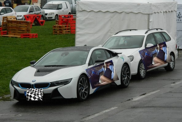 Apropo de modele cu electrica-n vene, acest BMW i8 a fost adus de unii care au treabă cu fumătorii. Noi nu avem tangenţe cu domeniul respectiv, pentru că ardem pneuri pe asfalt destule, aşa că am păstrat doar ceea ce contează. Maşinile. Pentru un plus de savoare artistică, am adăugat o reclamă mascată (pentru că nu i se vede chipul) cu o #mademoisellelavolan, evident.